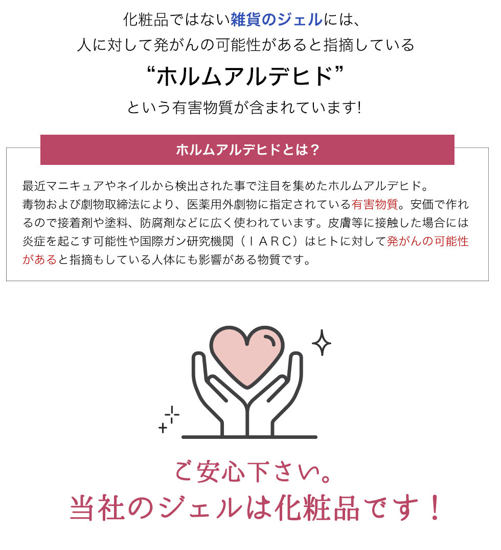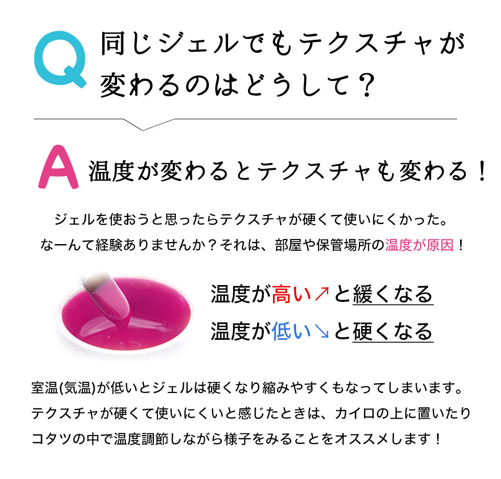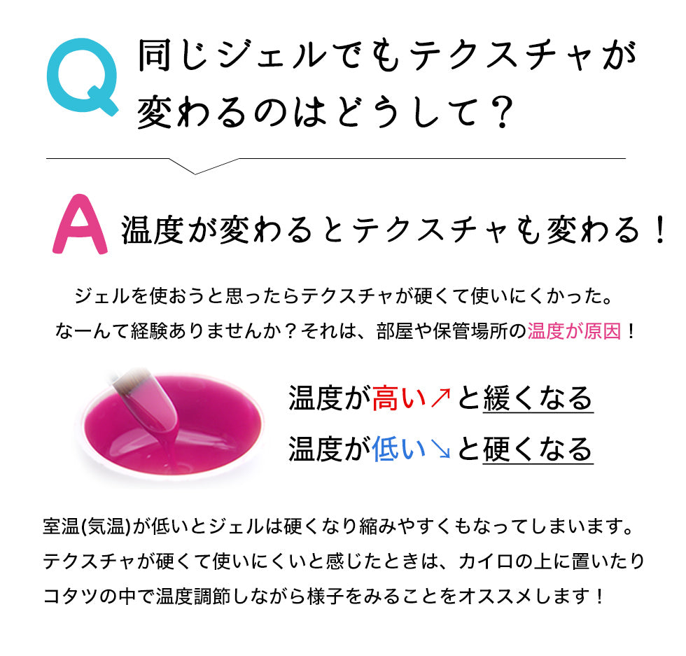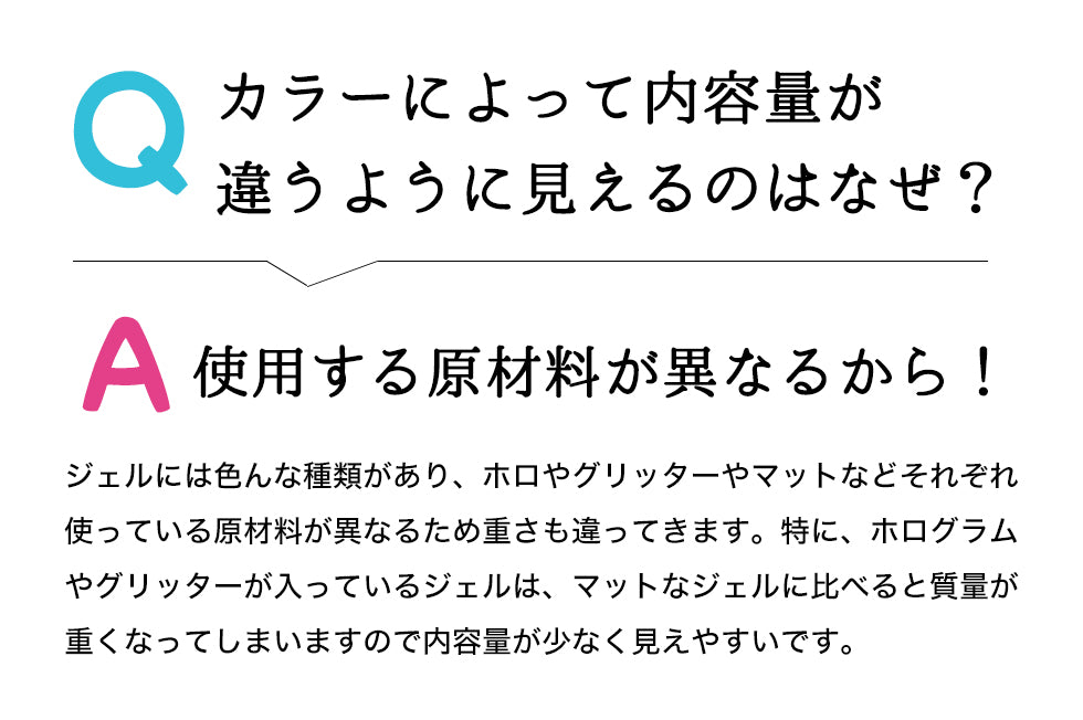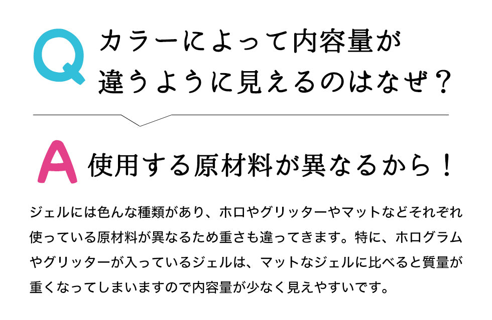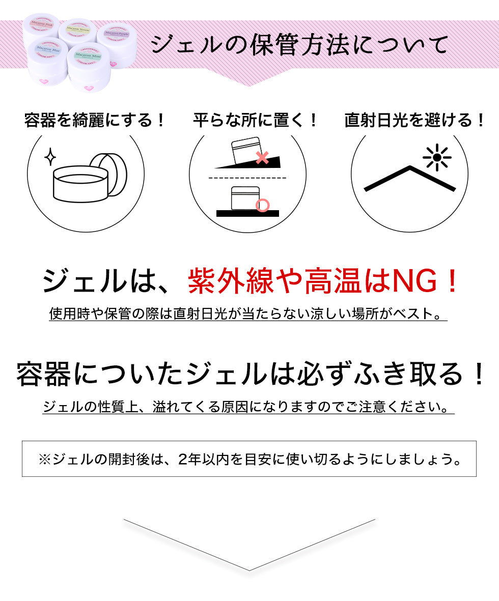 ・モニターによりカラーの見え方が若干変わります。・カラーの色味によって、 顔料の量に違いがある、ジェルのテクスチャー・硬化時間には若干の個体差がございます。 ・色やラメ・ホログラムの有無によって開封時に見た目の容量が異なる場合がございます。内容量は全て3gとなっておりますのでご安心下さい。・ 当店取扱いのLEDライト、UVライトに対応しています。UV/LED対応390~400nm