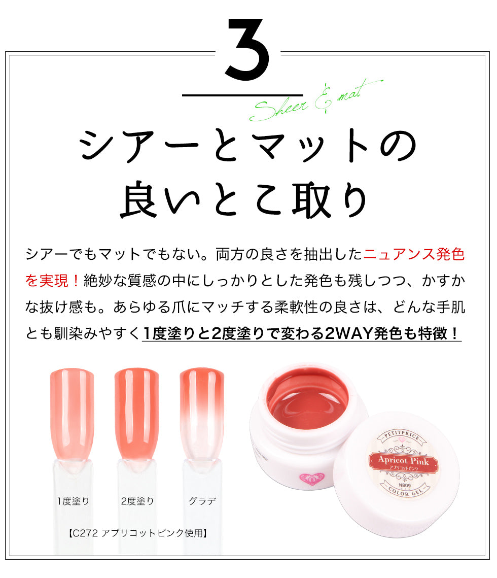 ・モニターによりカラーの見え方が若干変わります。・カラーの色味によって、 顔料の量に違いがある、ジェルのテクスチャー・硬化時間には若干の個体差がございます。 ・色やラメ・ホログラムの有無によって開封時に見た目の容量が異なる場合がございます。内容量は全て3gとなっておりますのでご安心下さい。・ 当店取扱いのLEDライト、UVライトに対応しています。UV/LED対応390~400nm